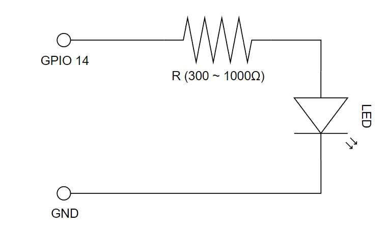 電源プラス側のとなるのがGPIOピンです。前回はコード上でGPIO14番を指定していましたので、今回の例ではGPIO14に繋ぎます。皆さんの方でコードの方をいじって好きなGPIOピンに設定して構いません※3。そこからLED、抵抗を介してラズパイのマイナス側、すなわちGNDに落ちるという極単純な回路になっています。