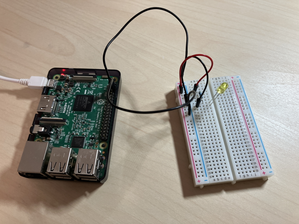 もし、何をやってもLEDが光らない場合、GPIO 14に挿しているプラス側のピンを、常時3.3Vを出しているピン(物理ピン1、左一番上)へ差し替えてみてください。もしそこに挿してLEDが光るのであればLEDや抵抗の配線は正常ですから、GPIOのピン番号や、コードそのものを確認してください。