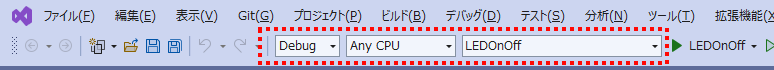 Visual Studio(VS)を開いて、LEDOnOffプロジェクトが含まれるソリューションを開いてください。標準ツールバーには図3の赤点線枠のような項目があります。これを左をDebug、真ん中をAny CPU、右をLEDOnOff(プロジェクト名)となるように設定してください。