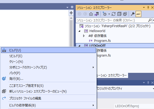 ですから、画面右のソリューションエクスプローラーから、LEDOnOffプロジェクトを右クリックして、ビルドだけを行います(図4)。
