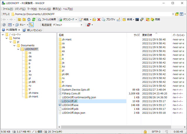 ラズパイへのコピーは第二回で説明したWinSCPというアプリを使うと便利でしょう。ログインできればドラッグアンドドロップでファイルをコピーすることができます。最初に作った試験アプリは、[home]-[pi]-[Downloads]配下に置きましたので、今回もここに置きます。フォルダ名が[net6.0]では分かりにくいので、[LEDONOFF]に変更します。