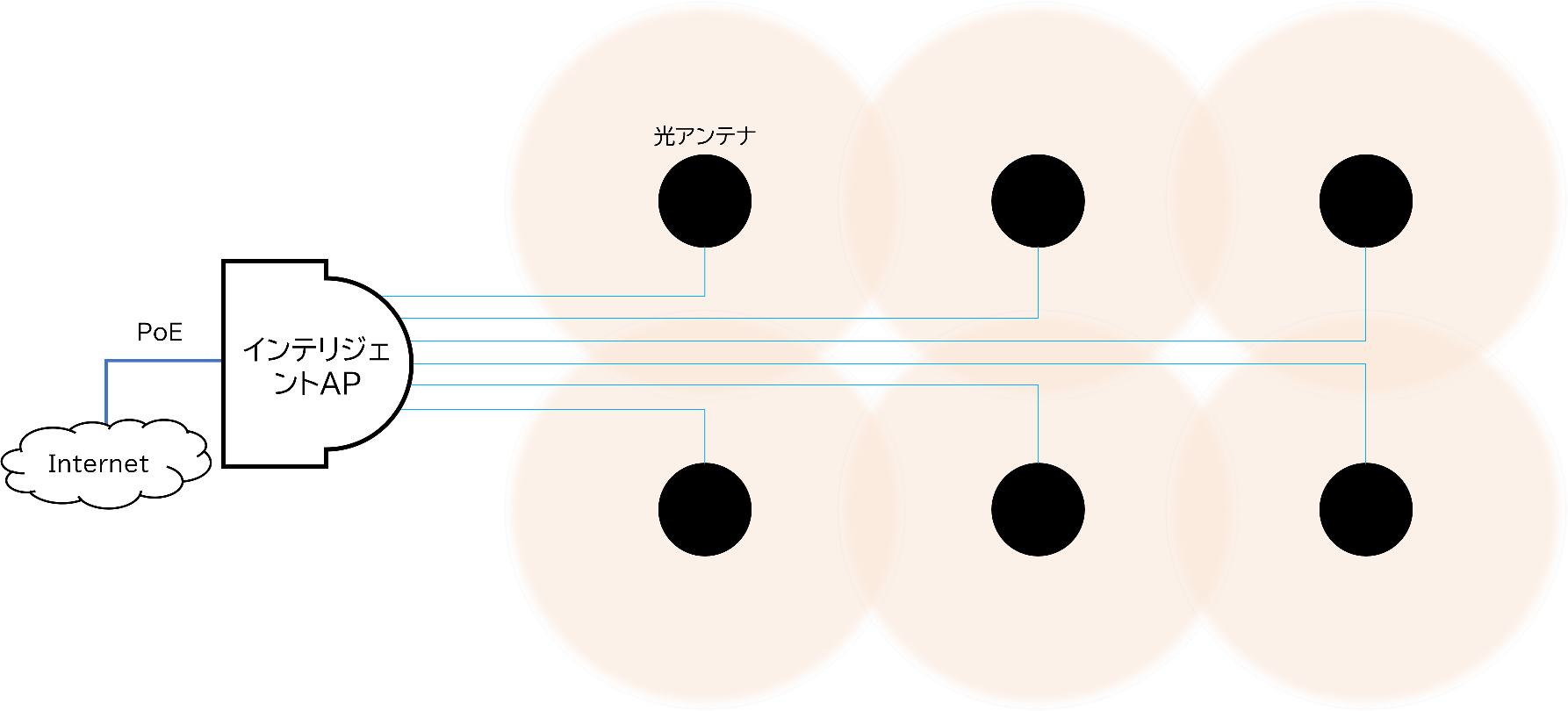 光アンテナ1台あたりの最大通信速度はおよそ130Mbps程度です。インテリジェントAPの出口は1000Baseのイーサネットのため、システム全体としての最大通信速度は1Gbpsとなります。尚、光アンテナの電源はインテリジェントAPから提供されるため、各アンテナに電源を接続する必要はありません。また、インテリジェントAPはPoEで動きます。