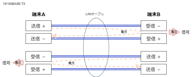 LANケーブルは双方向通信ってやつです。データを送ることも受けることもありますからね。だから、送信と受信の両方必要です。100BASE-TXでは、2本が送信用、2本が受信用で計4本の芯線を使います、というか4本しか使いません。送信側から電気を流して、受信側でその変化を受け取って信号に変換します。今「流して」と書きましたが、信号は電圧の変化として送りますので、電流はほんの微量しか流れないんですけどね。この図では端末Aから端末Bに向けた通信線が2本、その逆の端末Bから端末Aに向けた通信線が2本で、これが同時に行われているってことですね。