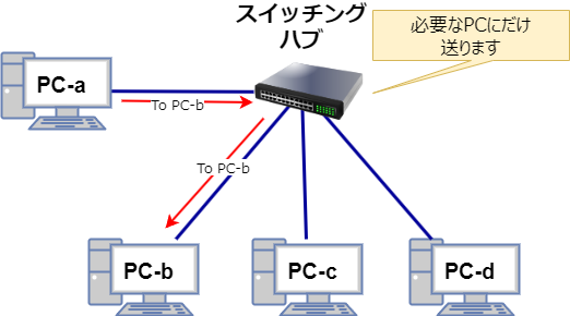 一方、最近(といっても結構前からですが)のハブは、そういった無駄なことをしません。どのポートにどのMACアドレスの機器が繋がっているか把握しています。どうやって把握するのかというと、送られてきたでデータの送信元を見て、どのポートにどのMACアドレスの機器が繋がっているか記憶するんです。記憶したら、必要な機器(ポート)にしかデータを送りません。PC-aからPC-bへデータを送る場合、ハブはPC-bだけにしかデータを送りません。このため、ネットワーク全体の負荷は低くなり、みんなが高速に通信できるようになります。このようなハブをスイッチングハブと呼んでいます。現在売られているハブは、ほぼ全てスイッチングハブだと思ってください。