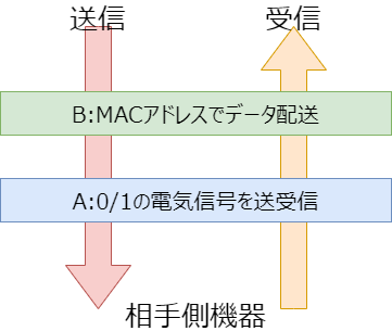 ところで、図に書いた見た目は機能が層のように並んでますよね?実際に、「層」とか、英語で「レイヤー」とか呼ばれていて、通信の機能は「レイヤー」ごとに与えられるようになっています。そして、出口(相手機器)に近い方から順番に番号が与えられていて、Aの電気信号の部分が「レイヤー1」、BのMACアドレスが「レイヤー2」と呼ばれています。イーサネットはレイヤー1とレイヤー2についての規格だと言うこともできるでしょう。