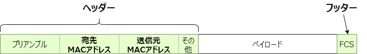 - ペイロードにプリアンブル、MACアドレス、FCSをつけて「フレーム」を構成する