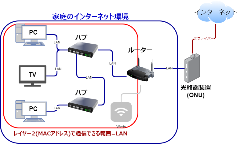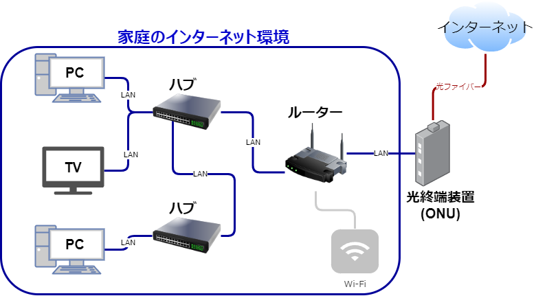 (プロバイダー)ー(ONU)-(ルーター)ー(ハブ)ー(ユーザー端末)