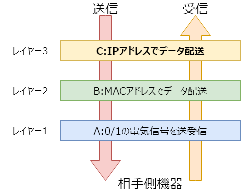 この辺を、先ほどのレイヤーの図にIPアドレスを加えて書いてみます。特に受信の方だけ見ます。