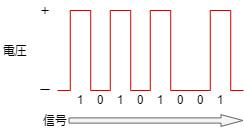 実際のデータの送信ですが、電圧の高低で0か1かを送信します。デジタルなので0と1です。上の図がそのイメージですが、これがまさにデジタル通信の基本の波形です。実際のLANケーブルではここまで単純な波形では無い※2のですが、おおよそこんなかんじで信号を送っていると考えてください。これをAからB、BからAの双方向で同時に行って通信をしているんです。結構簡単でしょ?