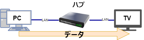この図はPCからハブを介して、TVまでデータを送る図です。PCとハブはLANケーブルで直接繋がっているし、またTVとハブも直接繋がっていますが、PCとTVは直接つながっていない、そんな構成です。PCの画面をテレビへにキャストするシーンなどは、このようなイメージになるかと思います。