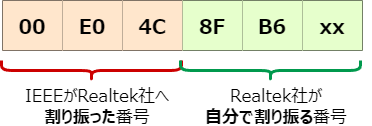 それは、IEEEというところが管理しています。アイトリプルイーと呼ばれるこの機関は、標準規格を管理していることで有名です。以前のブログでも光無線通信の規格の話で出てきています。で、ここがMACアドレスの番号を管理しているんですが、どうしているかというと「メーカー毎に番号枠を割り当てる」という形で管理しています。先ほどのMACアドレスの先頭6文字00-E0-4Cは、IEEEからRealtek社に割り当てられた番号です。他の会社は使えません。そして、Realtek社が下の6文字を管理し、重複しないように製造します。