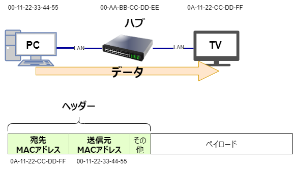 - データを目的地に送るため、宛先、送信元のMACアドレスをペイロードの前につける