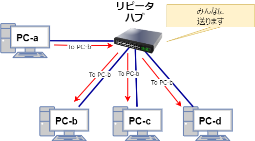 さて、ここで重要になるのがハブの動き。理解のために昔のハブの動きから説明しましょう。昔のハブは、繋がっている機器全てに、同じデータを流しました。例えば下の図PC-aからPC-bにデータを送りたい場合。PC-aからのデータは、ハブに繋がっている全ての機器に同じように送られます。図で言えば目的のPC-bだけでなく、PC-cやPC-dにも送られます。そのデータを受信したPC-bは自分のデータとして処理しますが、関係の無いPC-cとPC-dは送られてきたデータを破棄します。このように宛先関係無く全ての機器にデータを送るハブをリピータハブ、通称「バカハブ」と呼んでいます。リピータハブは、作りがわかりやすく単純で機器が安くなるんですが、関係の無いところまでデータが送られてしまうため、ネットワーク全体の回線容量を圧迫します。なので、みんなで高速通信をしようとすると、データが衝突してしまい上手くいきません。