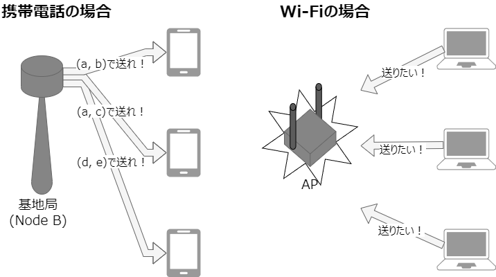 Wi-Fiが携帯電話と最も違う点を上げろと言われれば、私は「電波、チャンネルを共有している」だと答えます。お隣さん設置したAPが、自分のAPと同じチャンネルの電波を出していることもあるでしょう。2.4GHzなら電子レンジやBluetooth、メーカーオリジナルの通信(マウス用とか)も存在します。とにかく、Wi-Fiには自分たちのシステム以外からの干渉が沢山ありますから、Wi-Fiはそれ前提での設計がなされています。一方、携帯電話は少なくとも他システムからの通信や電波はないので、その部分だけでもコンセプトが大きく異なるわけです。誰も管理していない周波数の下での通信、つまりはどのような干渉が起こるかわからない、コントロールできない中で通信をどのようにして行うのか?ここがWi-Fiのというシステムの大きなポイントとなります。