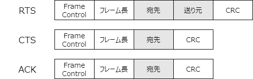 RTSやCTS、ACKといったフレームは非常に重要なものなので、最大の送信電力、最小のデータレート、最大の冗長性で送信され、確実に届くようになっています。また、CTSとACKは、APが送ったのか明白なのでフレームに送信元が記載されません。一方、STA側からおくるRTSフレームには宛先も送り元も記載されていて、若干の違いがあります。