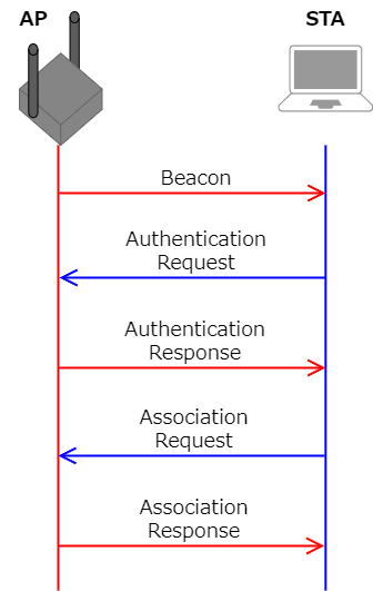 さて、ビーコンを受けて接続したいSSIDが決まれば、ウインドウに表示された「接続」ボタンを押して接続することができます。ユーザー側の操作は、ここからパスワードの入力などになりますが、内部の基本的なやりとりは次のようになっています。