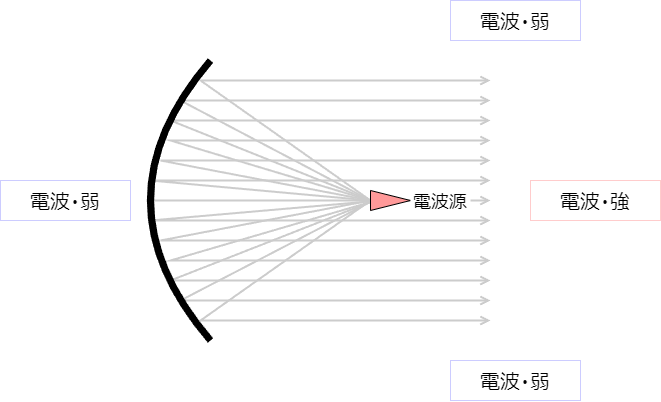 このパラボラアンテナというものはは、ほぼ正面にしか電波が飛びません。電波源から放出された電波は、凹面の反射板に反射するんですが、全ての電波が綺麗に真っ直ぐ一方に反射するように作られているからです。ですから、パラボラアンテナは、後ろは当然のこと横方向にもほとんど電波は飛んでいません。それどころか、数度角度が変わるだけで電波がほとんど飛ばなくなります。その代わり、正面方向の電波の強さを100倍とか1000倍にすることができます。パラボラアンテナの真正面しか電波が飛ばない代わりに、特定方向の電波をもの凄く強くすることができるのです。