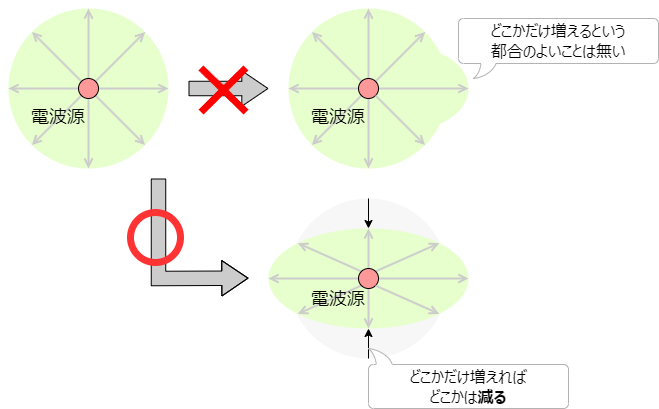 指向性は、方向によって強さが異なるという意味だけでなく、特定方向に強さ(エネルギー)が集まっているという意味も含みます。そう、集めているんです。生み出してはいないんです。集めているということは、どこかの方向に集めて強くすれば、どこかの方向は疎になって弱くなるんです。例えば、全方向に均等に出ているんだけど、「運良く」ある方向だけ電波が強くなった、といったことはないのです。どこかが強ければどこかは弱いはず。その理由は単純でアンテナから放出される電波のエネルギーを全て足せば、常に同じ量になるからです。