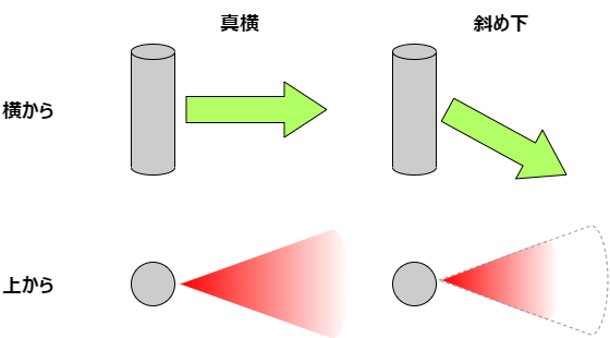下の段の赤い範囲は電波の飛ぶ範囲です。電波は真横に出したときは遠くまで飛びますが、斜め下に出したら、電波は飛ぶ範囲は小さくなります。電波を下に出したら、電波が飛ばなくなる、このことは誰でもイメージできると思います。