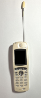 元に戻って、このポール型のアンテナは水平方向に指向性を持たないため、地面に垂直に立てて広いエリアをカバーする用途に向いています。例えば、ラジオ、アマチュア無線、一部の携帯電話基地局のアンテナに使われています※1。昔は、携帯電話の端末側もポール型のアンテナがついていたのですが、21世紀に入った頃にはほとんどが本体内蔵型に変わってしまいましたので、伸ばせるポール型のアンテナは絶滅してしまいました※2。下の写真は、自宅から発掘されたガラケー時代の携帯電話端末(第二世代)です。今は無き国際電気※3製の端末ですが、大切に保存していたわけじゃないので、黄ばんでボロボロなのはご容赦ください。いやー、改めて見ると伸ばしたアンテナの長さが本体ほどあったんですよね。私が若かれし頃は、通話中みんなこれを伸ばしていたっけ・・・ 尚、使っている周波数帯域は今と変わらない※4ので、20数年でのアンテナの進化もわかると思います。