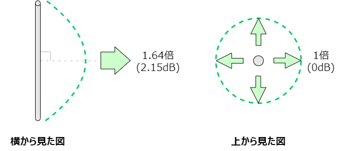 この半波長ダイポールアンテナは、垂直方向に緩い指向性を持ちますが、水平方向には全く指向性を持たないため、全体で見ると利得が低いアンテナと認識されています。そして、この半波長ダイポールアンテナは、理論上の利得が決まっています。周波数に限らず、半波長ダイポールアンテナの利得は1.64倍。前の方でも1.64とやけに細かい数字を連呼していたことに違和感を持った方もいると思いますが、この数字、無線に携わるものであれば全員覚えさせられるものなので、つい出したくなってしまう数値なんですよね。ちなみに、1.64倍はデシベルに直すと2.15dBi。これも覚えなきゃいけない数値です。