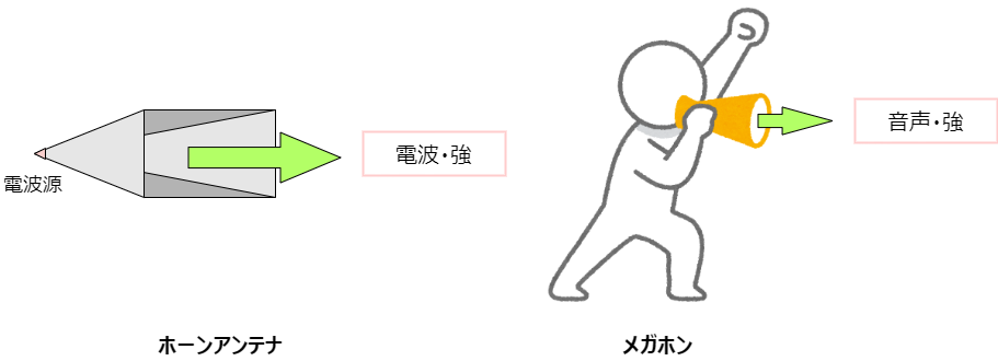 ホーンアンテナは、文字通りホーン(管楽器)の形をしたアンテナです。その役割もホーンやメガホンと同じです。四方八方に広がる電波を反射させながら、開口部に向かって飛ばします。電波の発信源の辺りの断面積は狭いですが、開口部に渡り広くなっていきます。四方に繰り返し反射しながら電波が出ていくことにより、開口面と垂直の方向に強い指向性を持つようになります。これも楽器やメガホンと同じです。