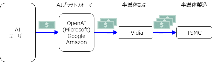 A: そうか、生成AIを遡っていくと、TSMC※4とnVidiaにたどり着くのか。そしてその二社が儲かるようになっているのか?nVidiaなんて、ただの謎の半導体メーカーのはずなのに。