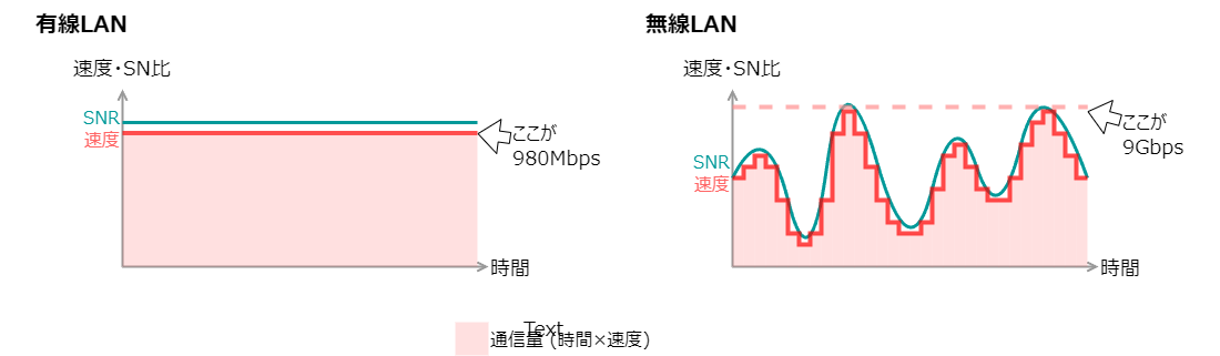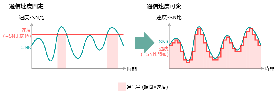 これまでの速度固定のグラフより、圧倒的にピンク色の面積が大きいことがおわかり頂けるでしょうか?通信速度を細かく変動させることにより、SN比の変動に合わせた通信速度を選ぶことができ、その結果無駄なく効率的に通信ができるようになります。