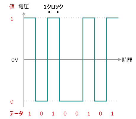 PAMはPulse Amplitude Modulationの略で、日本語ではそのまま直訳で「パルス変調」と呼ばれます。デジタルPAMは、単純に電圧のON/OFFや、プラスマイナスだけで通信するため、仕組みも回路も単純にできるた、多くのデジタル(有線)通信で使われています。例えばLANケーブルなんかも、(適応変調はしませんが)この方式を使っています。ただし、周波数の利用効率が良くないので、無線で使われることは多くありません。でも、先ほど書いたとおり、変調を変化させるってことを理解するのには最適なので、こちらを使用して説明していきます。