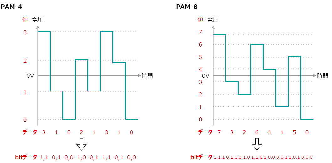 さて、ここから1クロックにおけるデータ量を変えていきます。データ量をどのように変えるかというと、プラスとマイナスだけしか判断していなかったのを、電圧の違いまで判別させます。例えば、0と1の2段階しかなかったものを、0、1、2、3の4段階に変えます。4段階のPAMなのでPAM-4という呼ばれ方をします(下図左)。このPAM-4ですが、4段階、0~3まで区別するようにしたため、ビットでいうと2ビットで表現されます。ということは、PAM-4は1クロックで2ビット分送ることができることになります。ですから、普通のPAMとPAM-4で、同じクロックで動いていたとすれば、通信速度はPAM-4が普通のPAMの2倍になります。次に、電圧の区切りをさらに細かくして8段階にします(下図右)。8段階なのでPAM-8ですが、0~7までの数値が表現できるので、ビットで言えば3ビットです。ですから、PAM-8は通常のPAMの3倍の速度でデータを送ることができるということになります。このように、電圧の閾値をさらに細かくしていけば、理論上、通信速度は無限に早くできるはずです・・・