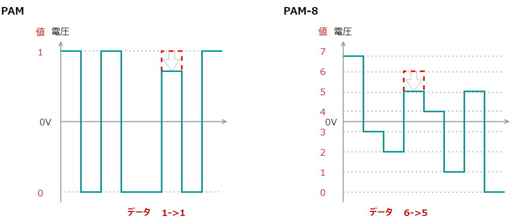 下の図は、何らかの理由でPAMとPAM-8で、本来の電圧より、受信機器の測定電圧が下がった時の図です。通常のPAMでは、ちょっと電圧が下がったぐらいではデータは変わりませんが、PAM-8で過ごし電圧が下がると、データが別のものになってしまうということが分かります。PAMではプラスとマイナスを区別するだけで良かったものが、PAM-8ぐらいだと、有線通信の場合0.5Vぐらいの差を判別しなければいけません。0.5Vの差って、ノイズもあるし、送信、受信側の機器の誤差もあるので、たとえ有線通信であっても、判別するのが結構きつい差です。このように、高い速度の変調では、かなり高いSN比、特に低いノイズを要求されるってことです。一方、プラスとマイナスの判別だけなら、通信は遅くなりますが、かなりSN比が低くとも判別できるってことは、容易に想像できますよね?