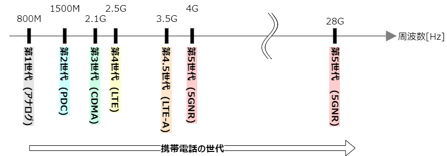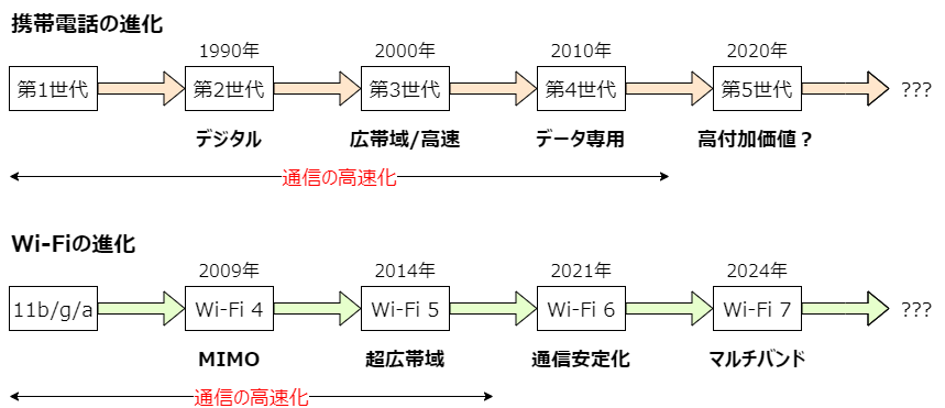 皆さんに一番身近な無線通信と言えば、携帯電話とWi-Fiでしょう。恐らく、今このブログを呼んでくださっている人は、携帯電話、つまりはスマホ経由か、PCのWi-Fiでインターネットに繋げている方がほとんどのはず。だとすれば、無線通信の未来は、携帯電話やWi-Fiの未来と同じ意味ではないか?と。まあ、勝手にこじつけておりますが、ここでは、とりあえず今後の携帯電話やWi-Fiの方向性と課題ということで考えていきましょう。まず、最初に、これまでの携帯電話、Wi-Fiの進化の過程を見てください。