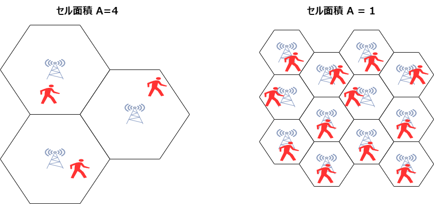 携帯電話の1つアンテナがカバーする範囲をセルと呼びます。無線基地局の数を増やすというのは、セルの面積を小さくすることと同じ意味です。例を出しましょう。仮に、ひとつのセルに1人しか通信できないとしましょう。そして、ここに2つの土地があります。それぞれ土地の面積は12で、そこをカバーするのに3つの基地局を使う土地と、12の基地局を使う土地があります。前者の1セルの面積は4、後者の1セル面積は1になるはずです(下図)。セル面積=4の場合、土地面積12に対して、3人しか通信できませんが、セル面積=1の場合は、12人通信できます。これは、後者の通信容量が前者の4倍になっているということになります。つまり、面積辺りの通信容量は、セルの面積に反比例することを意味します。