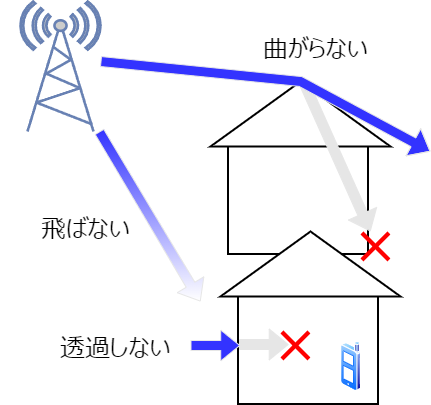 だとすると、問題になるのは「飛ばない」よりも、「透過しない」ことなんですよ。どれぐらい透過しないのかっていうのは、材質やら形状やらによって違うので、定量的なデータを出すのが難しいのですが、確実なのは周波数が高いほどあらゆる物質を透過しなくなるってこと。飛ばない上に透過しないから、4GHzより上の周波数ぐらいだと、室内まで電波が届くことを期待しにくい。5GHzのWi-Fiの電波を考えてください。自宅のWi-Fiの電波って、壁とか天井でガンガン減衰しますよね?マンションとか壁が厚いところだと、2.4GHzの電波なら届くのに、5Gだと使えないってことも多々あります。