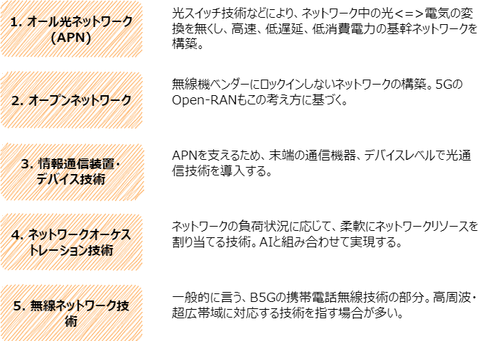 というわけで、では携帯電話の次世代、6GともBeyond 5G(B5G)とも呼ばれますが、それの技術的に実現すべきものとしてどういったものが考えられているか、見てみましょう。B5Gの研究課題は、情報通信審議会から、「産官学で取り組むべきB5G研究課題10種類」という形で紹介されています。下の図は、その課題ですが、右の注釈は筆者がわかりやすく付けたものです。