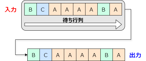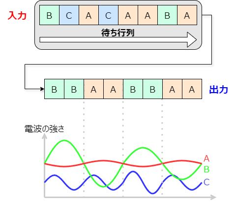 スケジューラーとして、最も簡単でわかりやすいのはFIFO(First In, First Out)です。日本語で言えば、「早いもの順」ですね。(人間が並ぶ)お店などでの待ち行列が、まさにFIFOです。図にすると、こんな感じです。Aさん、Bさん、Cさんがいて、それぞれがデータ送信をリクエストしていきますが、先にリクエストした順に、そのまま出力されます。