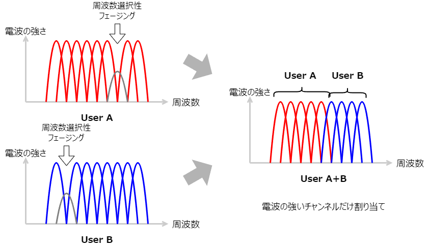 現在の携帯電話やWi-FiはOFDMA方式※2を使っているため、マルチチャンネルで通信しています。OFDMA方式のスケジューラーは、チャンネル毎に電波の強さを判断することができます。例えば、OFDMAのチャンネルの中には周波数選択性フェージングで電波が弱くなるチャンネルが出てきます。その時、スケジューラーはそのチャンネルを使わない判断をし、そのチャンネルを他のユーザーへ割り当てるようにします(下図)。これにより、周波数選択性フェージングを回避できます。