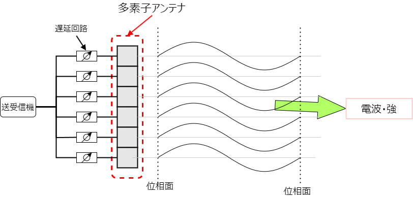 アンテナの指向性の方向を変えるには、多素子アンテナという、小さいアンテナがいくつも集まったタイプのアンテナを使います。このタイプのアンテナは、一つ一つのアンテナの指向性は低いですが、いくつも並べることで指向性を上げることができます。原理的には、一列に並んだ小さなアンテナからでる電波の位相を揃えることで、電波を真っ直ぐ進むようにしているってことになります。これは、電波の位相面が揃っている方向に強く進むことを意味しています。