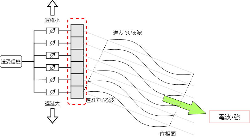 で、この多素子アンテナで、ちょっと位相をいじる、つまり遅延を入れて電波を遅れさせると、位相の面を斜めにすることができます。下の図で言うと、アンテナ素子が下になればなるほど遅延が大きくするようにすると、上の素子ほど電波が速く放出され、下の素子ほど電波が遅く放出されるため、位相面が下向きになります。その結果、下向きに強い波が出ていきます。このように、多素子アンテナでは、この波源の方向、すなわち位相面の角度を、遅延を制御することで変えているというわけです。