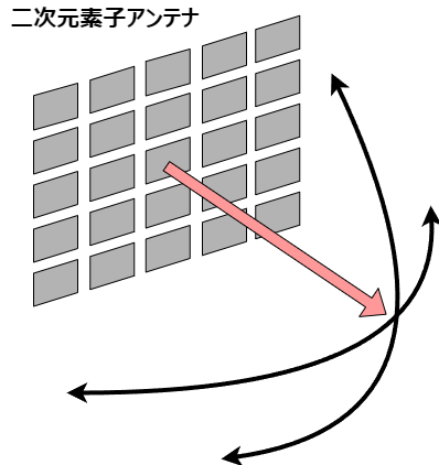 ここまで説明したとおり、多素子の位相をコントロールすることで、電波の強い方向、すなわち指向性の方向を変えることができます。尚、上の例は、アンテナ素子が縦一列に並んでいるため、アンテナが並んでいる方向(縦方向)に指向性を変化させることができたわけですが、これを縦横の二次元に配列してみたらどうでしょう。アンテナ面の前方であれば、縦にも横にも指向性を変えることができる、ということになると思いませんか?そう、なるんですよ。多素子アンテナを二次元に配置すれば、上下左右好きな方向に、指向性の向きを変えることができるんです。