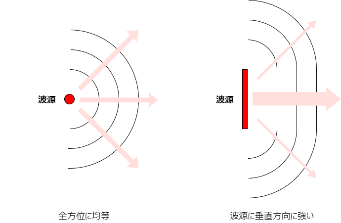 これ、本当かと思う方がいると思いますが、水面の例で例えれば、簡単に納得頂けると思います。例えば、水面。1点を叩いて波を起こした場合、波は360°均等に放射されます。しかし、木の棒の様な長いものでで波を起こした場合、棒に垂直な方向へ強い波が進みますよね?理論的に言えば、打ち消しあったり強めあったり、どうのこうのあるんですが、もう皆さん、感覚としてこの辺をご理解頂けると思います。このように、ある程度の長さをもって位相面を揃えて波を出すと、位相面の方向に指向性がつくのです。