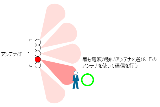 その方法は、至って簡単。単純に、遅延回路など持たない、やや指向性の高い普通のアンテナをいくつか並べます。全体をカバーできるようにアンテナは配置します。そして、通信時はもっとも条件の良い(電波の強い)アンテナを選んで通信すれば良いんです。どうです?簡単でしょ?前述の高度なビームフォーミングほど、指向性も上げられない(アンテナの数が多くなりすぎる)し、やや装置も大型化しちゃいますし、まあ技術的には劣ります。でも、単純で安い。