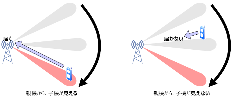 - そのタイミングであれば、基地局の指向性は端末の方を向いており、基地局は端末からの電波を受信出来ますので、基地局は端末の位置(電波の方向)を把握でき、双方向通信が開始できるようになります。