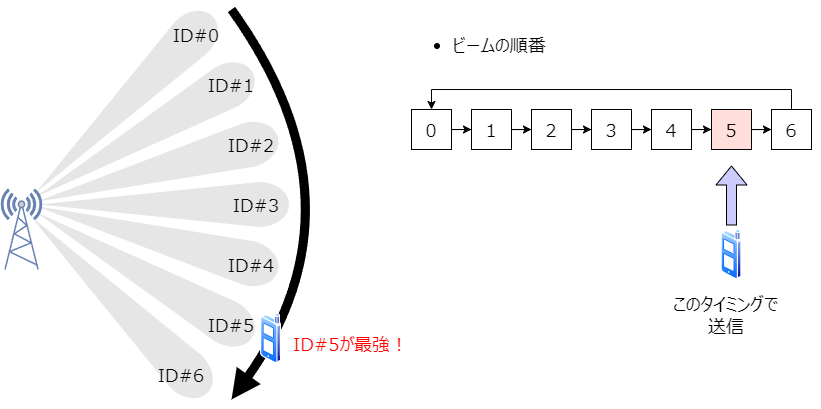 - 電波の方向(パイロット信号の方向)は、規則的に変わるようになっていますので、目的のIDの電波が来るタイミングは一定周期です。基地局情報を受信した端末は、その周期を把握します。