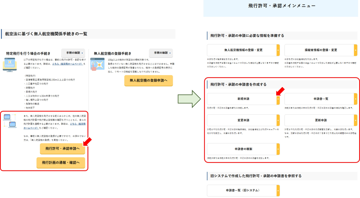 DIPSトップページから「航空法に基づく無人航空機関係手続きの一覧」の左側「特定飛行を行う場合の手続き」から「飛行許可・承認手続きへ」をクリックします。