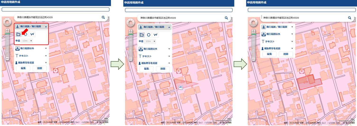 「飛行経路/飛行範囲」をクリックするとサブメニューが展開するので、四角形のアイコンをクリックした後、マップ上で頂点を指定していきます。頂点の指定と削除は行えますが、指定後に頂点を移動させることができないので、複雑な範囲指定となるとマップとにらめっこすることになります……