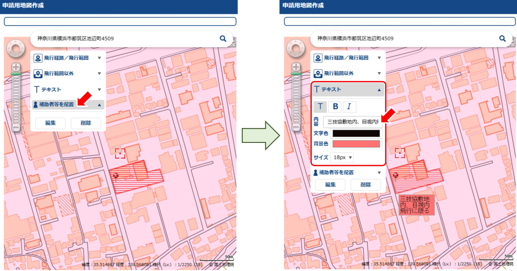 また「テキスト」をクリックするとサブメニューが展開するので、テキストボックス内に注釈内容を入力し、マップ上でクリックすると入力したテキストを配置できます。三技協敷地内でのみ飛行させること、目視内飛行に限った飛行を行うことを強調しました。