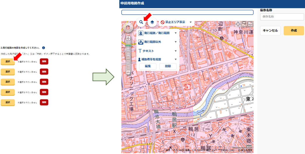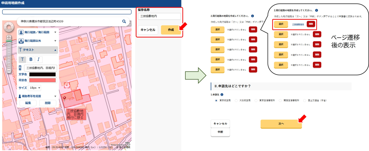 この際「2.飛行経路の地図を作成してください。」の欄がマップを展開する前後で変化がないかと思います。マップ情報は保存されているものの、ページ遷移を伴わない場合変化が無いだけですので、注釈に記載の通り一度中断した後に同ページに戻れば、先程の保存名称で保存された飛行経路が確認できます。