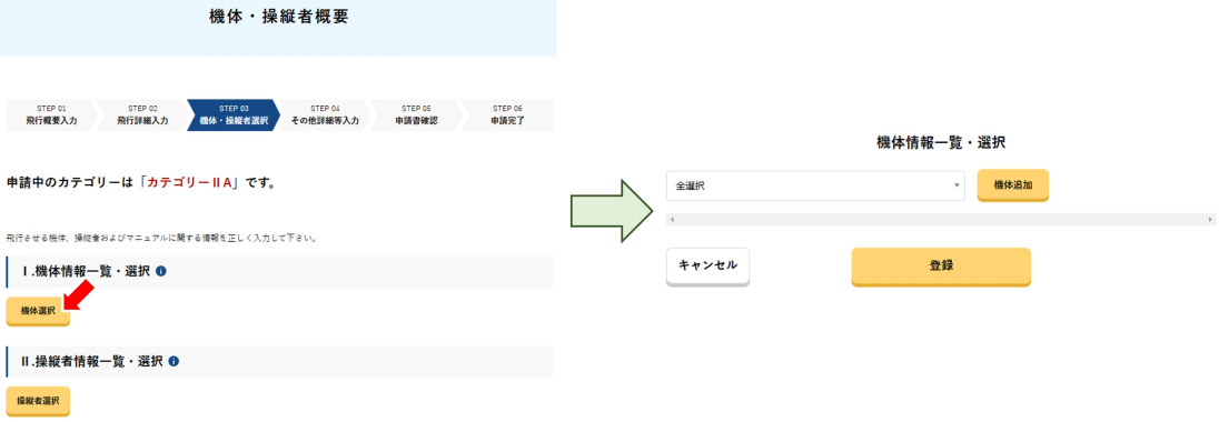 機体・操縦者概要の画面に移りましたら「Ⅰ.機体情報一覧・選択」から「機体選択」をクリックします。