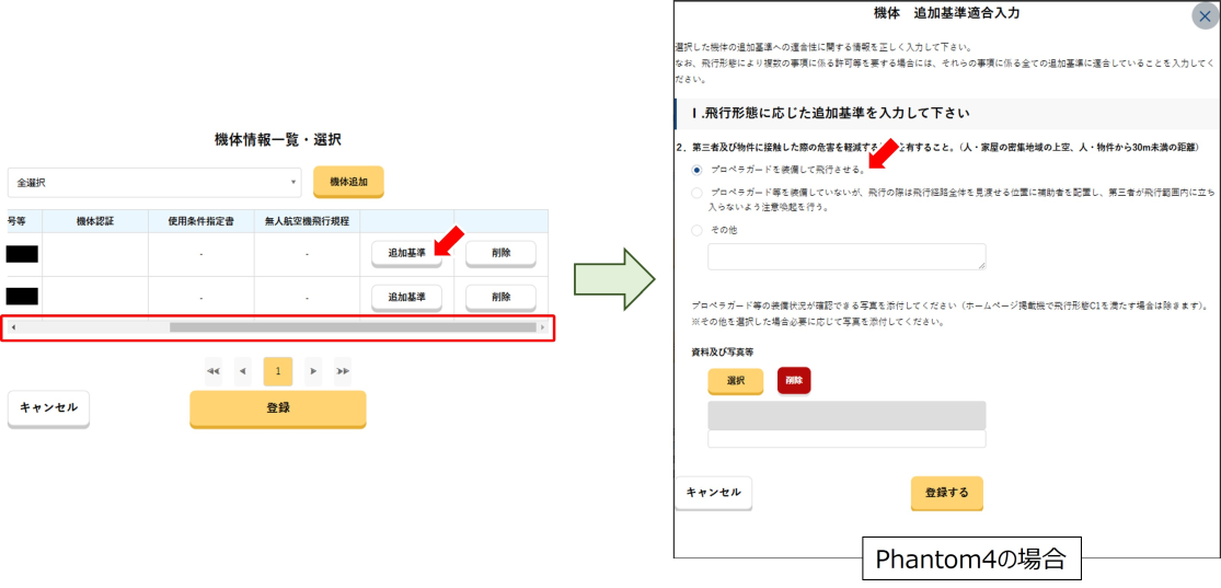 まずはPhantom4の場合ですが、資料の一部を省略することができる無人航空機(令和6年4月19日付)に含まれる機体ということで「プロペラガードを装備して飛行させる。」にチェックを入れ、下部にある「登録する」をクリックするだけで完了です。接触時の被害を軽減する能力が、プロペラガード装着により担保されることがすでに確認済みの機体ということで、プロペラガード装着時の写真添付も不必要です。以前書きましたが、この省略については「※上記資料に掲載する無人航空機に係る申請において書類の一部を省略可能とする運用は令和7年12月に終了します。」とのことですので、それまではひと手間削減できます。
